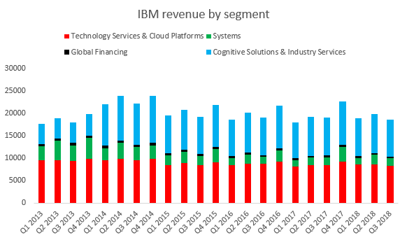 IBM released its earnings report for the third quarter of the fiscal year on 16 October. The company managed to provide minor beat with EPS ratio at $3.42. On the other hand, revenue came in at $18.756 billion against expected $19.085. Looking at particular segments Technology Services and Cloud Platforms, IBM’s biggest business segment, generate 2% smaller revenue on the annual basis. This is a worrying sign but planned acquisition of Red Hat may help this segment get back on the growth track. Other major segment - Cognitive Solutions - also experienced a YoY drop in revenue while Global Business Services and Systems segments managed to increase sales on the annual basis. However, the fourth quarter is usually the most busy one for IBM and this time will be no different due to deals with Economical Insurance, ExxonMobil or Novis.