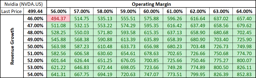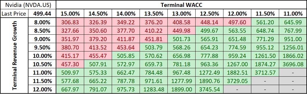 We decided to base our assumptions more or less on 5-year averages, but with a small twists to revenue and operating margin assumptions. We have assumed a 50% revenue growth and 60% operating margin for the 5 years of forecasts with other assumptions being based on 5-year averages. For the terminal value calculations we have used a 10% revenue growth as well as 13% terminal WACC, down from 15% WACC used for 5 years of forecasts to capture the effect of AI business maturing. Such a set of assumptions provides us with an intrinsic share price of $656.98 - or around 31.5% above yesterday's closing price. However, a note of caution is needed that there is a high uncertainty around revenue and operating margin assumptions, given that Nvidia's dominance in AI is likely to wane over time as more and more companies enter and develop in the field. Also, it should be noted that terminal value forecast accounts for over 92% of the DCF forecasts.