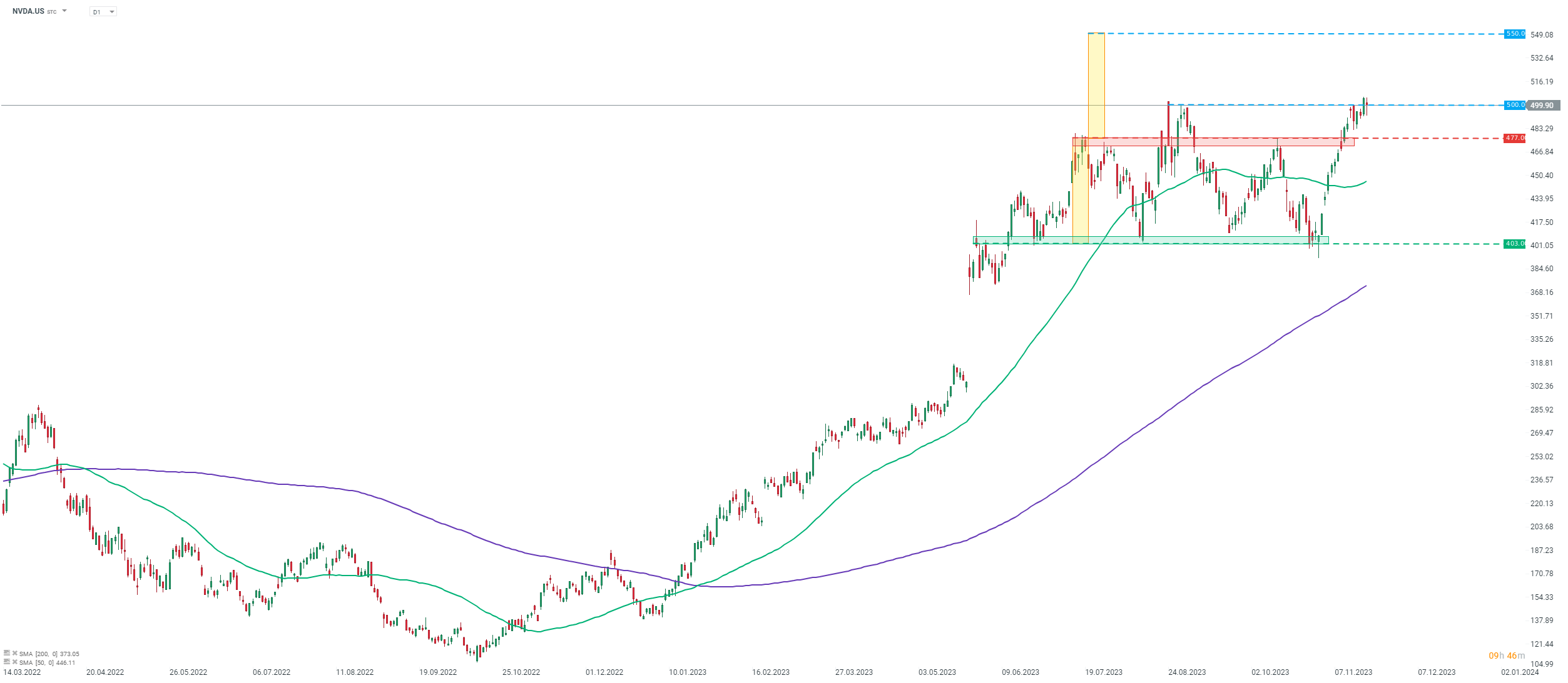 Last but not least, let's take a quick look at Nvidia chart (NVDA.US) at D1 interval. We can see that the stock has been trading sideways in the $403-477 range recently. Stock managed to break above the upper limit of the range and climbed to the $500 area marked with previous all-time highs, which were reached during a previous false upside breakout from the range. Flat performance of the company's shares in premarket shows that investors have second thoughts about growth outlook following recent steep rise in share price. Should we see the stock start to pull back, the upper limit of the earlier-broken trading range in the $477 area will act as the first potential support. On the other hand, should we see bulls regain control and push the stock higher, the first potential target will be $550 area, where the textbook range of the breakout from the sideways move can be found.