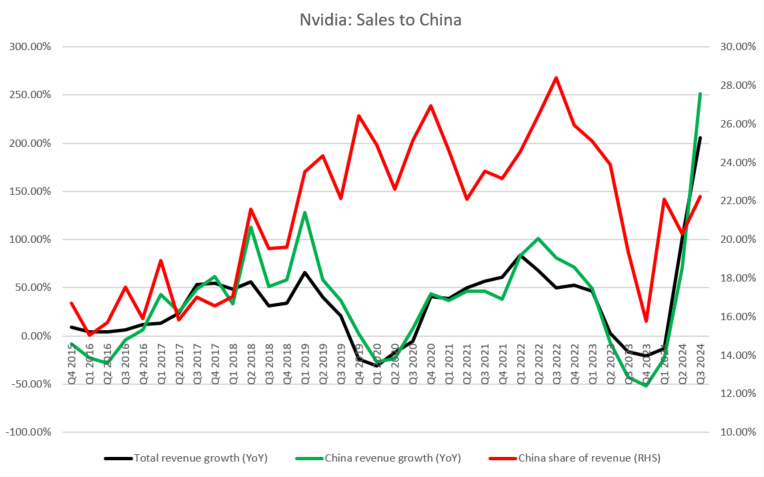 Apart from releasing solid fiscal-Q3 earnings, Nvidia also provided upbeat forecasts for fiscal-Q4 2024. Company expects revenue in the final quarter of fiscal year to reach $20.0 billion, plus or minus 2%. This would mark a year-over-year growth of 224-237%, as well as quarter-over-quarter growth of 8.2-12.6%. However, not everything in the outlook was so rosy. Company noted that new licensing requirements will significantly lower its sales to China in fiscal-Q4 2024 and highlighted that China accounted for around 20-25% of its Date Center revenue in recent quarters. On the bright side, Nvidia said that it expects solid sales in other regions, that will more than offset the drop in sales to China.