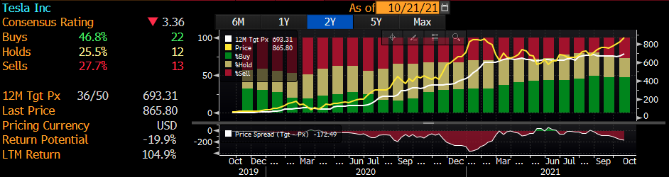 While analysts decided to boost the price target recommendation for Tesla following earnings release, median target compiled by Bloomberg is still almost 20% lower than current market price. Source: Bloomberg