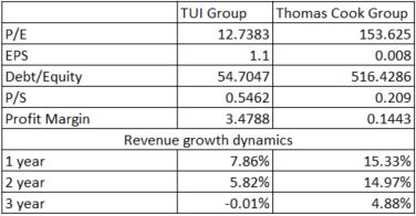 Comparing TUI Group against its biggest local competitor, Thomas Cook Group, one can see striking differences between the two. First of all, Thomas Cook Group has much steeper P/E ratio, reflecting investors’ trust in the ability to maintain growth. Moreover, Thomas Cook looks almost 10 times as indebted as TUI. EPS and profit margin are higher for TUI.However, the revenue dynamics is much higher for the Thomas Cook Group so investors may expect higher profits down the line . Nevertheless, it should be noted that Thomas Cook Group is much smaller entity than TUI. TUI had over four times bigger market capitalization than Thomas Cook Group at the end of 2017 and its revenue was almost twice as big as Thomas Cook’s. On top of that, let’s say that comparing those two particular travel companies is more than justified (apart from differences in size) as the United Kingdom is the biggest market for both TUI and Thomas Cook and therefore risks and uncertainties associated with the Brexit are more or less equally reflected in the financial data of both stocks.