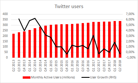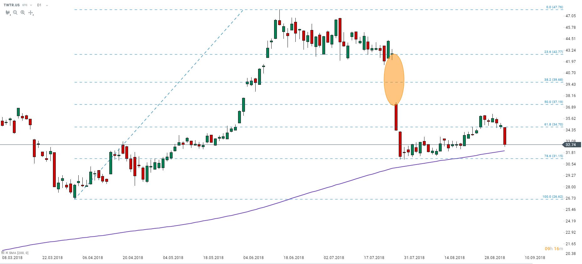 The latest earnings report released by Twitter was not in any way unsual when we look at the face of it. The company showed a minor beat in terms of both revenue and EPS. The gross margin came in at 78.8%, way higher than market consensus provided by Bloomberg suggested (68.7%). EBITDA at 264.8 million USD was also higher than median estimate. However, the number of monthly active user declined a bit. While this could be viewed as a temporary setback (Twitter experienced such situation before), the guidance issued by company is weaker than previously. The company warned investors that the drop in monthly active user may extend over future periods. Moreover, Twitter recognized the impact of new data protection regulations introduced in the European Union recently and said it may negatively affect company’s business. On top of that, full year guidance for capital expenditures was raised quite significantly, from 375-450 million USD range to 450-500 million USD. In turn the company’s share price took the biggest one-day dive since 2014, erasing as much as 20% of Twitter’s valuation.