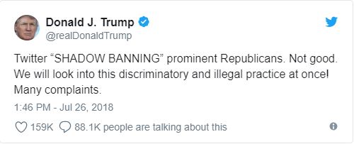 Donald Trump accused Twitter of “shadow banning” accounts of some Republicans in July. Source: Twitter
