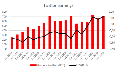 After few years of continuous losses Twitter climbed above the break-even line in Q4 2017. Source: Bloomberg, XTB Research