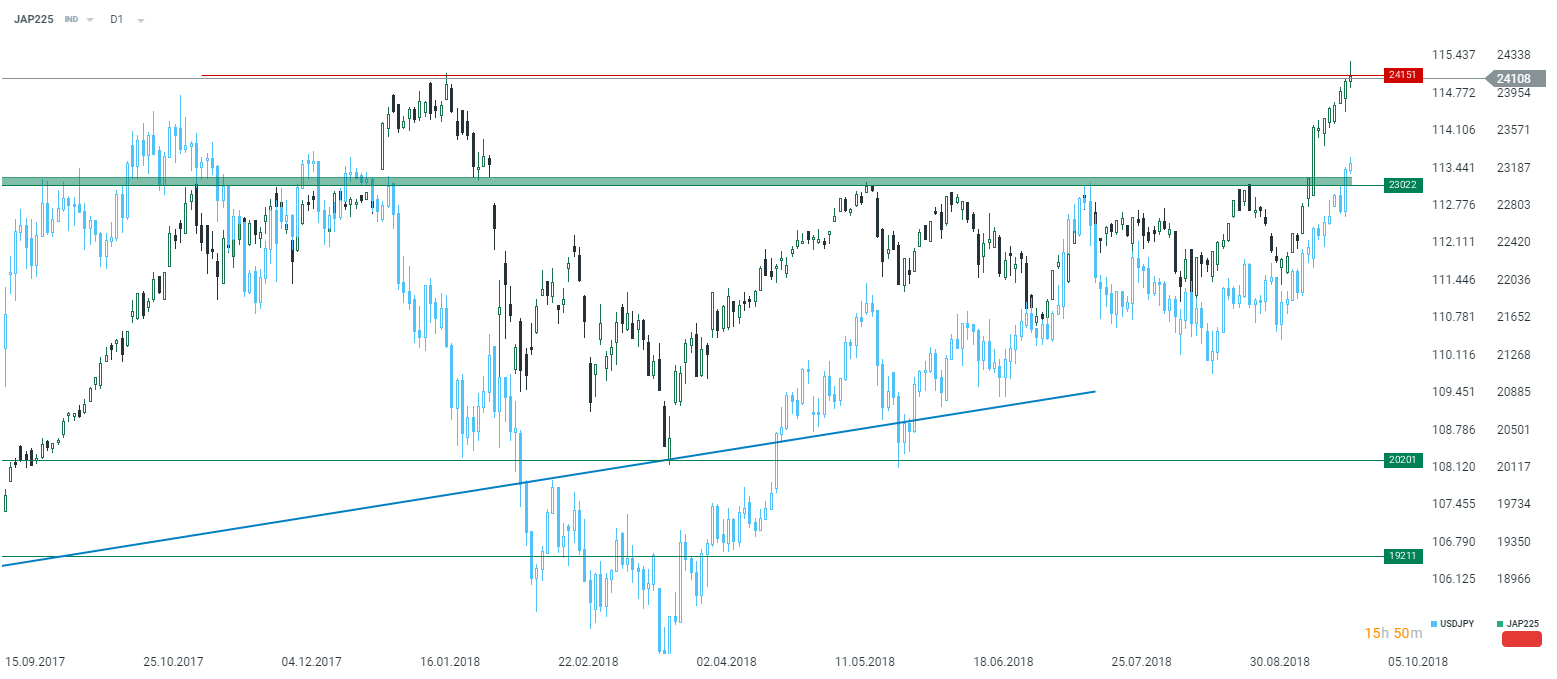The NIKKEI is flirting with its all-time high of around 24150 points being shored up by the rising USDJPY. However, given the wild pace of the latest bullish swing one needs to be aware that some corrective moves could arise before long. Source: xStation5