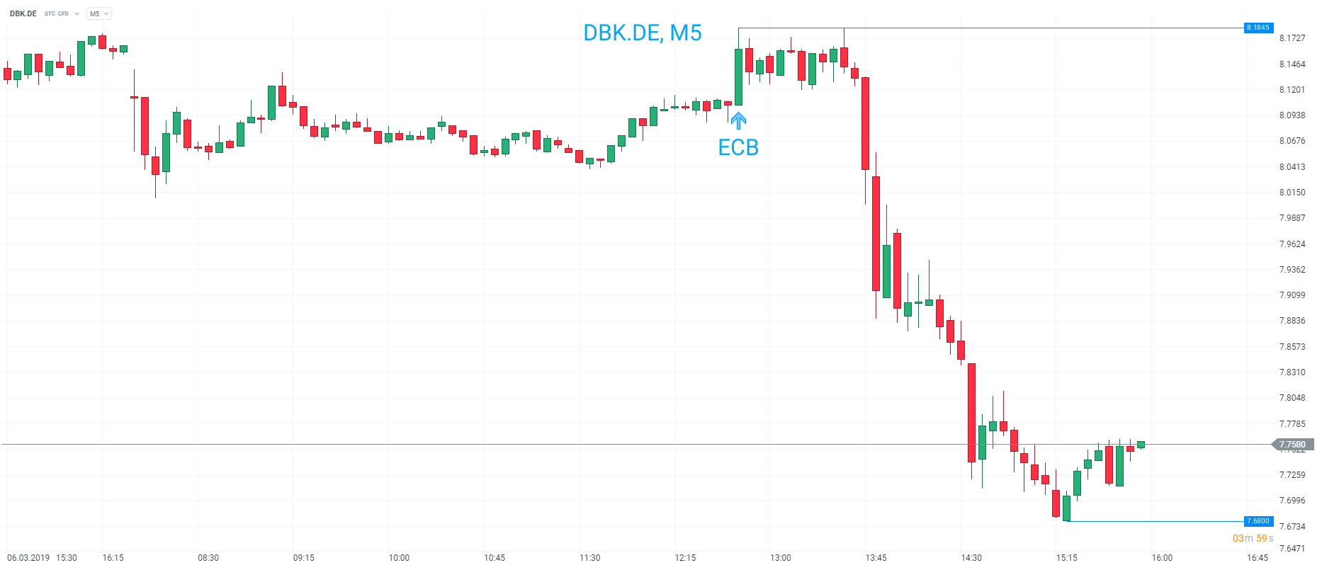Deutsche Bank has tumbled after initially moving higher after the ECB announced the TLTRO, with the stock now lower by more than 5% on the day. Source: xStation