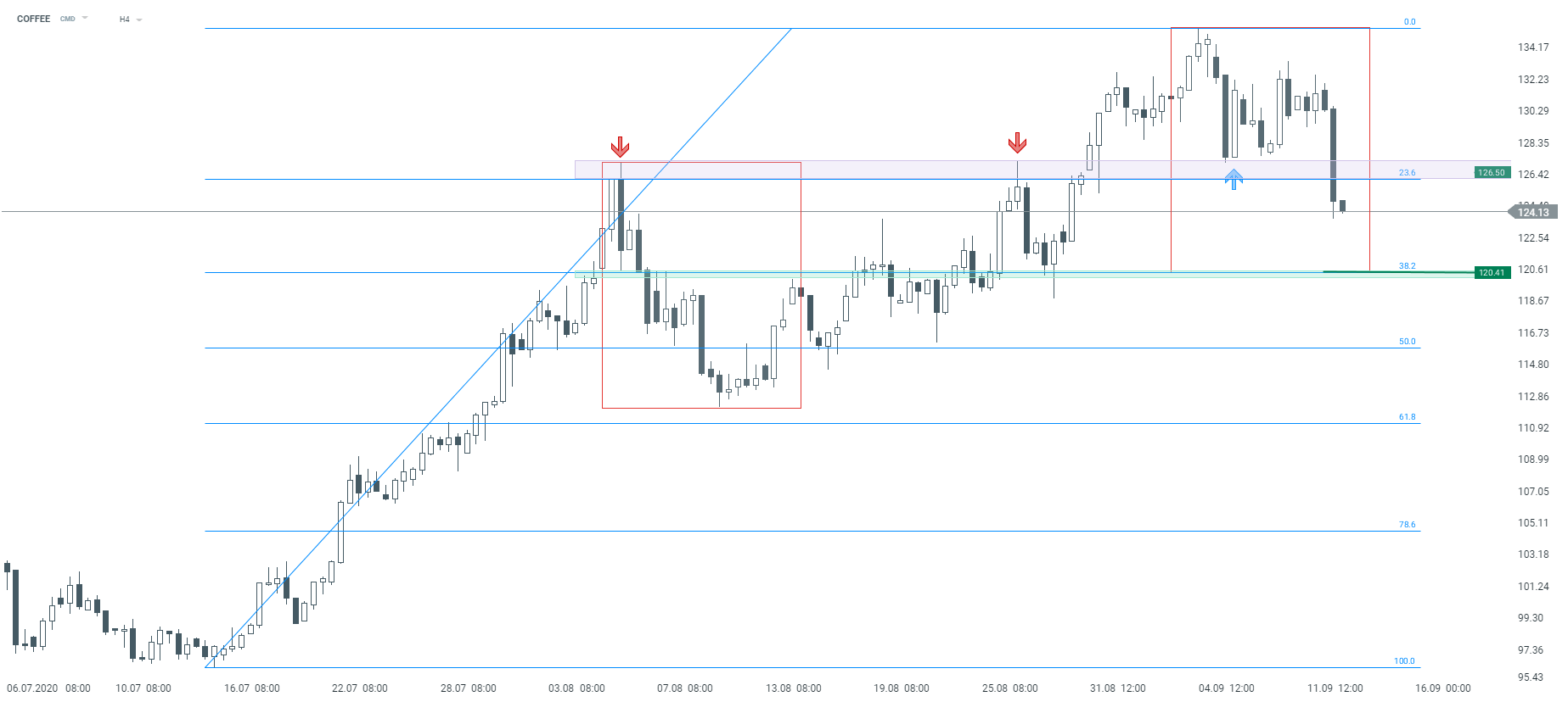 The coffee price is more than 5% down during today's session. Looking at the H4 chart from technical point of view, the price returned below the key support at 126.50. Therefore the current drop may deepen to 130.40 where the next major demand area is situated. The area results from the lower limit of the 1:1 structure and the 38.2% Fibonacci retracement of the recent upward swing.