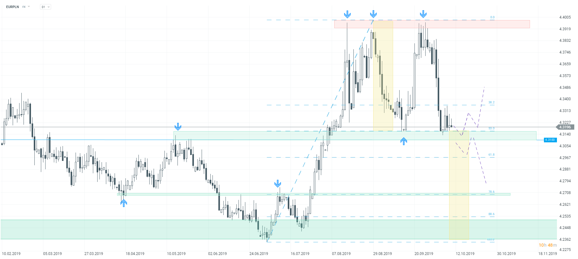 Looking at the D1 interval, one can see a bearish triple top formation on EURPLN currency pair. The price failed to break above a resistance at 3.39 handle and declines followed. EURPLN is trading in a key place now. Buyers managed to defend the support zone during the first attempt of breaking lower but the pair remained under pressure. The area at 4.31 is marked with the 50% Fibonacci retracement, the neck line of triple top formation and the highs from May 2019. Breaking below it could trigger a deeper decline. Yellow box on the chart above shows potential range of triple top pattern. However, one should remember that the aforementioned zone at 4.31 handle remains the key support and as long as the market stays above it, the trend remains upward. When the EURPLN drops below this key support, one should pay attention to the two next Fibonacci retracements - 61.8% and 78.6%.