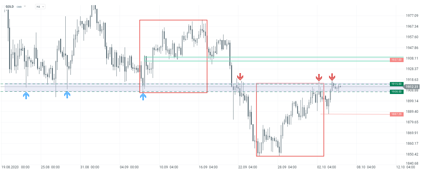Looking at the gold market on H4 interval, one can see that the price is once again testing the key resistance area. The zone marked with a purple colour on the screen below results from the upper limit of 1:1 structure and previous price reactions. According to the classic technical analysis, as long as the price sits below the $1,915, continuation of the downward move looks possible. However, one should keep in mind that the chance of breaking above increases with each subsequent test.