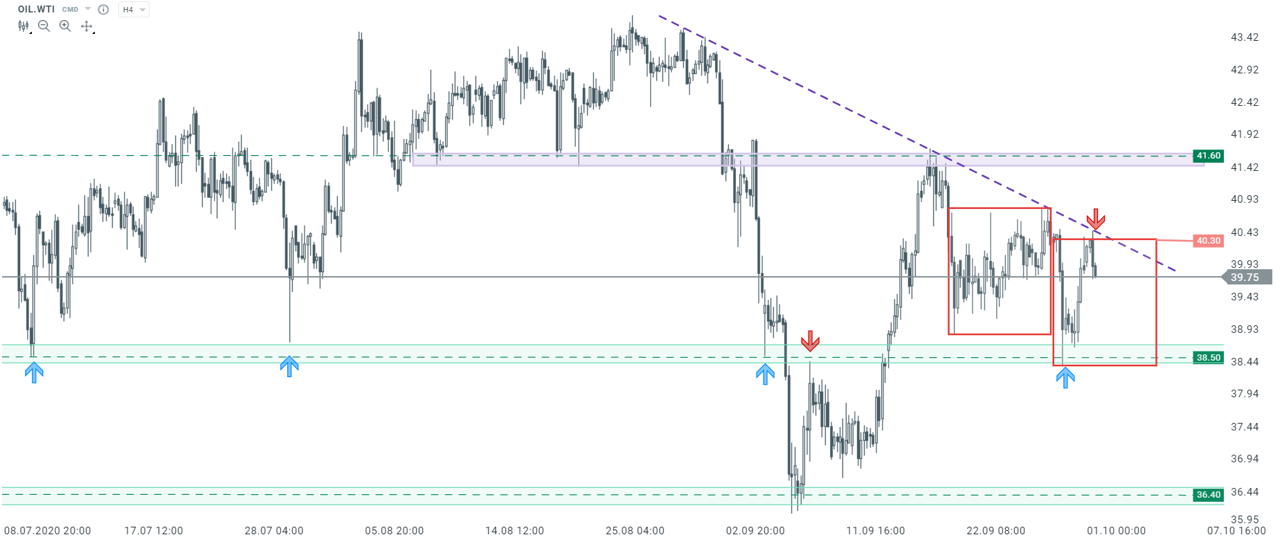 OIL.WTI stopped the upward move at the key resistance area today. Commodity bounced off the upper limit of 1:1 structure, which was also strengthened by the downward trendline. As long as the price sits below the $40.30 handle, the further downward move is the base case scenario. The nearest support to watch lies at $38.50, where the previous price reactions can be found.