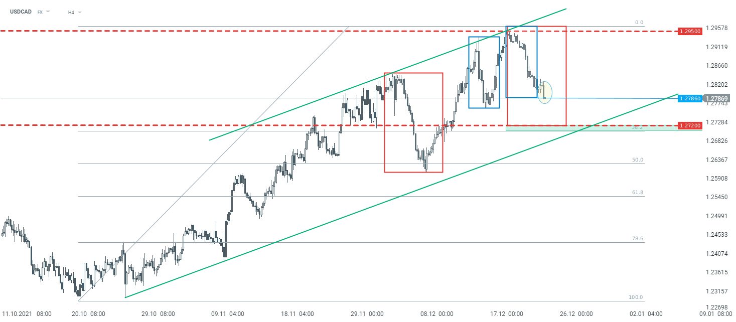 We can observe low volatility on the forex market during today's session, which is related to the holiday season. Nevertheless, the US dollar is slightly weakening against the Canadian one. Let's take a look at the technical situation on the USDCAD currency pair. Looking at the H4 interval, there is an upward trend from the end of October. However, the pair failed to break above the resistance at 1.2950, and the downward correction began. We should focus our attention on two support levels at the moment. The first support is being tested and results from the lower limit of the local 1:1 structure, marked with blue. The second support seems to be stronger, it is the zone at 1.2720. The area marked in green results from the lower limit of the wide 1:1 geometry, marked with a red rectangle, and the 38.2% Fibonacci retracement of the recent upward swing started in late October, as well as the lower limit of the upward channel. According to the classic of technical analysis, only negation of the mentioned zone could change the trend downward.