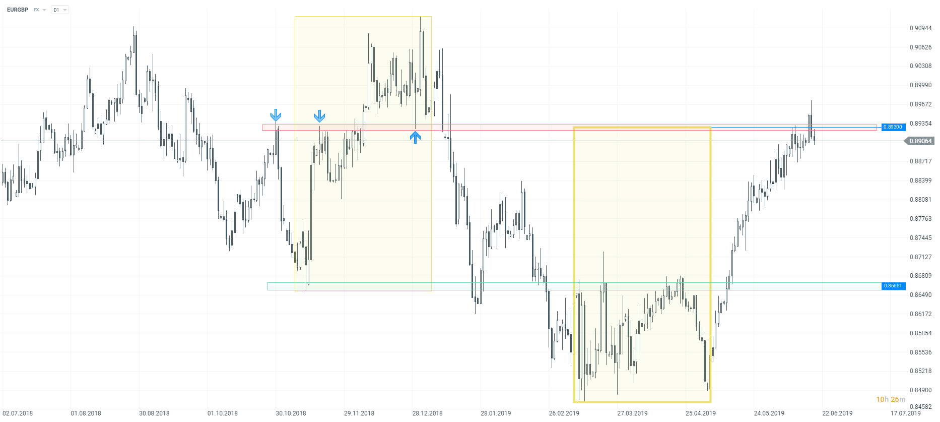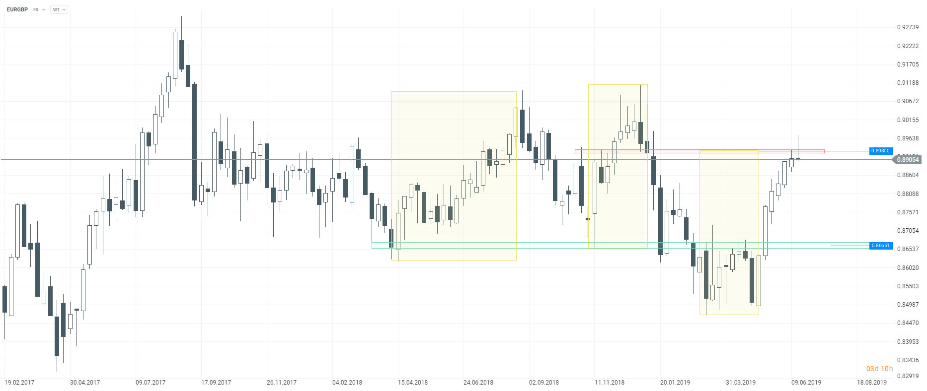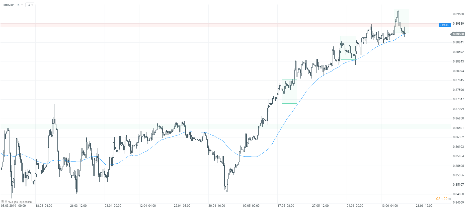 Taking a look at the D1 interval, we can see that the price struggles to overcome the 0.8930 handle. This level is important from a technical point of view due to the 1:1 market geometry - the ongoing upward movement matches range of the one from late-2018. Additionally, the bearish engulfing candlestick pattern has been drawn on the daily interval what could be the first signal for bears.
