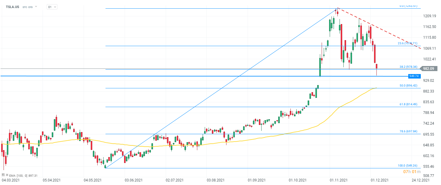 Tesla (TSLA.US) shares have outlined an incomplete double top formation and are currently testing support set by the recent bullish upward gap. Maintaining these levels should encourage the demand side to test local resistance levels near the 23.6% Fibo retracement. If share prices fall below $950, the key support will be the 50% retracement, which coincides with the 100 EMA (yellow line). Source: xStation 5