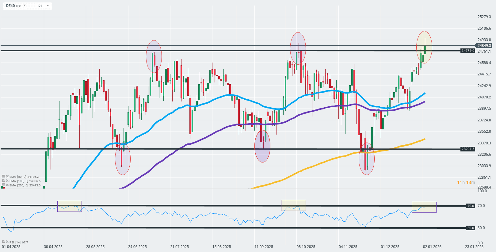 At the beginning of the week, the DAX is gaining dynamically and breaking above the main upper limit of the broad consolidation zone that limited the DE40 in 2025. If today's session closes the upper body of the intraday candle above this zone, it could mean that the previous barrier has been broken and the DE40 is paving the way for further gains towards the ATH. However, a pullback below this structure may resemble the earlier behavior of the 2025 contract, when stronger pullbacks began from these levels. Technically, however, looking at the 50- and 100-day EMAs, which remain below the DE40 quotations, the long-term uptrend remains unshaken. Source: xStation