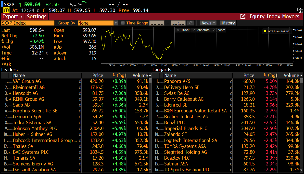 The German DAX (on the cash market) is currently gaining nearly 0.65%, while the French CAC40 is up 0.12% and the British FTSE100 is up 0.24%. The German stock market is primarily driven by the rising value of Rheinmetall (RHM.DE) shares.