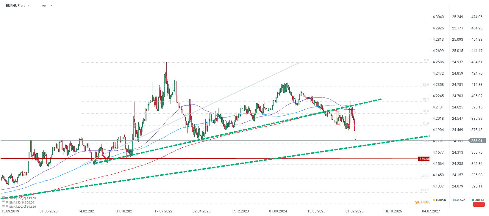 EURHUF is dropping to the 366 level, its lowest since April 2022. A potential further 5% appreciation of the forint would provide an opportunity to test 350, a level not seen since September 2021. A move below 360 would also represent a break of the 15-year upward trendline. Source: xStation5
