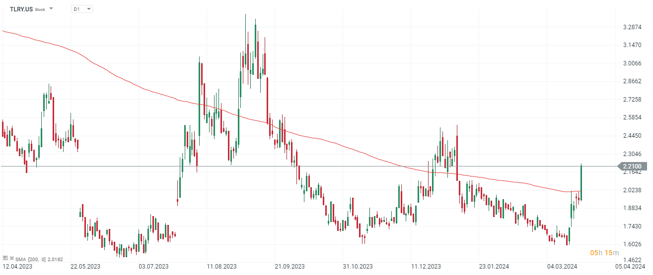 Shares of companies related to the medical marijuana market are seeing euphoric gains today. Shares of Tilray (TLRY.US), Canopy Growth (CGC.US), Aurora Cannabis (ACB.US), and Cronos (CRON.US). Earlier this week, Vice President Kamala Harris spoke optimistically about the U.S. administration's efforts to date to reduce federal regulations. Positive news also came from Germany, which intends to loosen regulations, providing cannabis legalization.