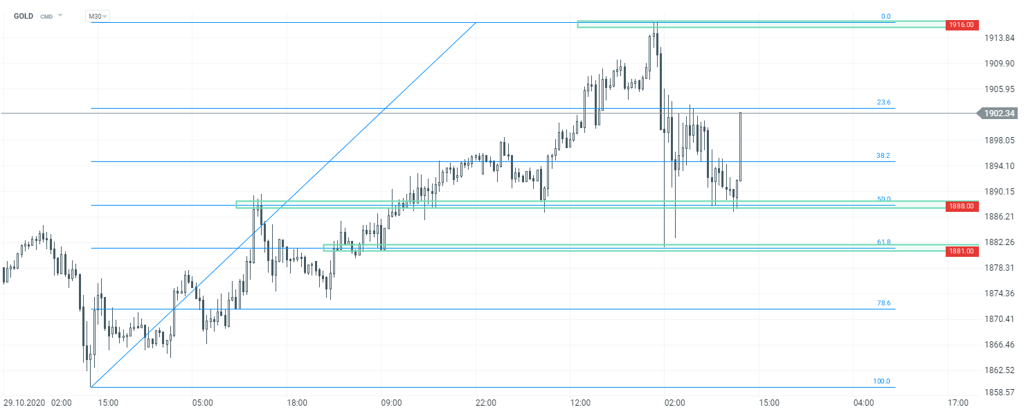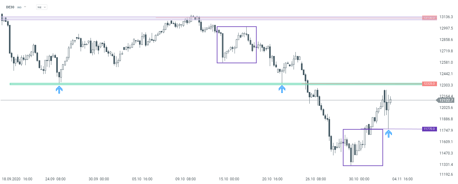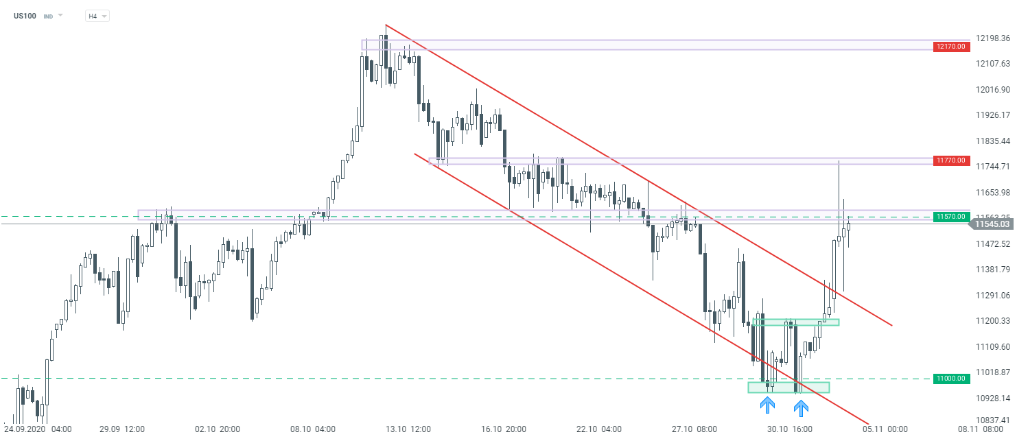 Last night was a very volatile one on the global markets. While we still do not for sure who has won US presidential elections, odds seem to favour Democratic challenger Joe Biden. Let's take a look at how the technical situation on US100, GOLD and DE30 looks like.