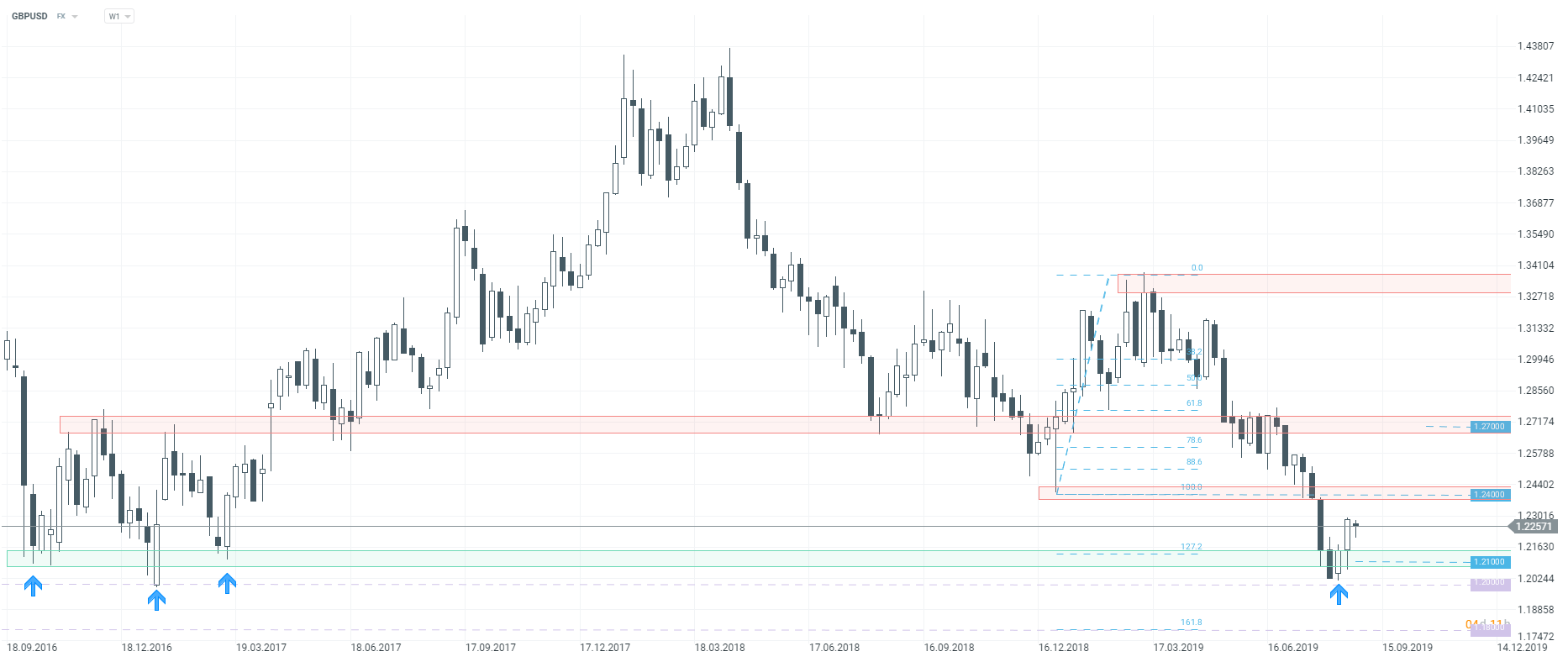 The British pound has found itself under pressure recently. However, looking at the W1 interval, one can see that bulls managed to defend the key support at 1.2100. The upward movement observed last week was triggered by remarks made by the European politicians on Brexit. The German Chancellor Angela Merkel said that she could find an alternative to the backstop issue in the near future. GBP surged on the news.. Meanwhile, Boris Johnson continues to label Brexit the most important challenge for the government at the moment and keeps reiterating that he will do whatever it takes to make it happen. Looking at the GBPUSD chart from a technical point of view, the pair may extend the upward move to as high as the 1.2400 handle, where the key resistance level is located. However, the upward move we are observing right now is just a correction. A break above the 1.2400 handle could herald bigger upward move. It should also be noted that each subsequent test of the support level at 1.21 increases the likelihood of breaking lower. In such a scenario, the way towards 1,1800 handle, where is the 161,8% Fibo level can be found, would be left open.