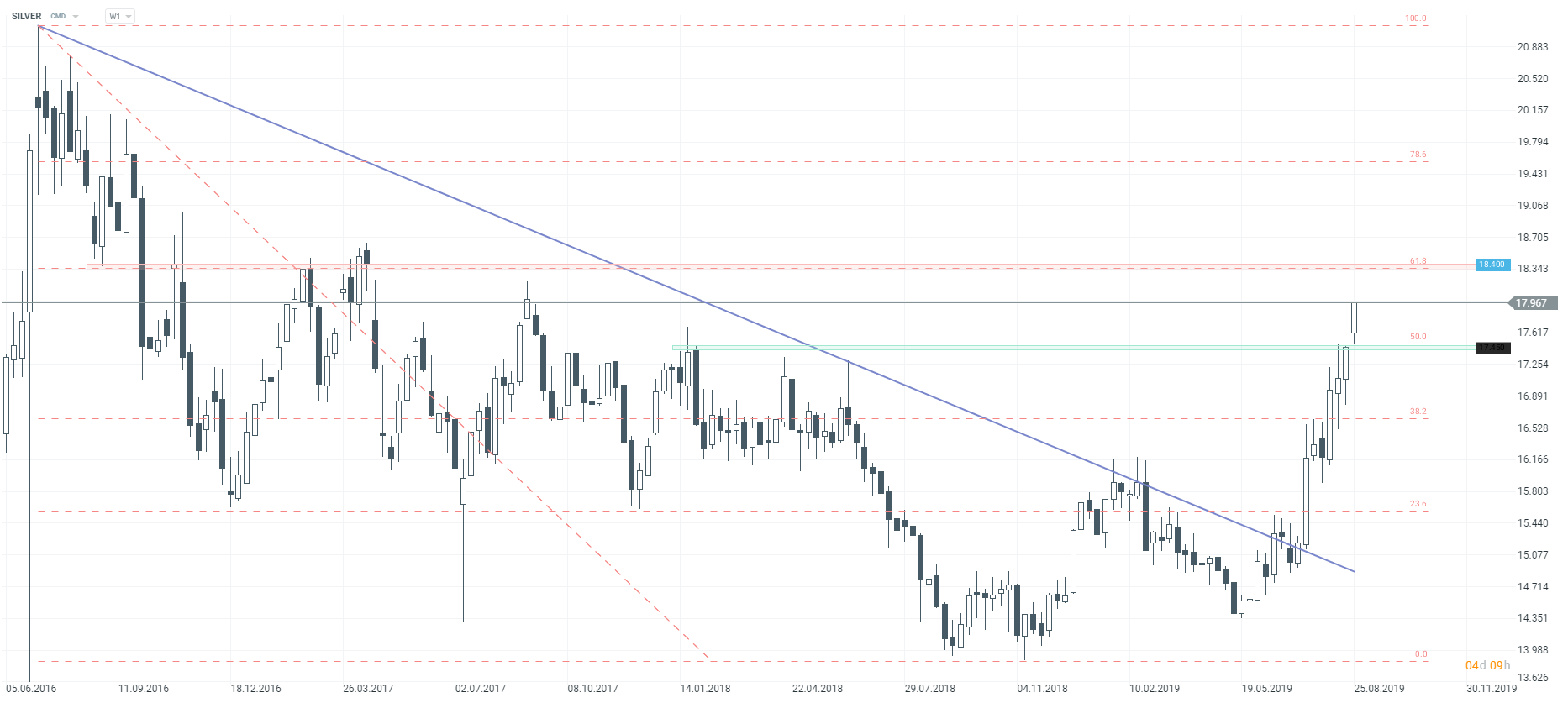 Silver breaks above the 50% Fibonacci retracement