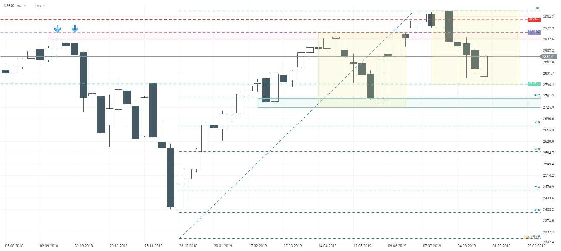 In spite of an attempted recovery, weekly candlestick for the previous week closed near weekly low.. Another escalation in the Sino-US trade conflict was the prime reason behind index weakness Beginning of a new week brought a kind of relief as the two sides seemed to have hit a softer tone on trade.. Looking at the chart from a technical point of view, the situation barely changed. Should the positive moods persist, the upward move could be extended in the second part of the week. The key resistance zone is localized in the vicinity of the 2950 handle and unless a break higher occurs, the index may continue to trade sideways. On the other side of the range, one can find the support at the 2800 handle, that is marked with the 1:1 system. Nevertheless, even a break lower does not have to lead to a larger sell-off, as the support zone marked with the 38.2% Fibo level and the lows from 3rd March and 2nd June can be found slightly below it.