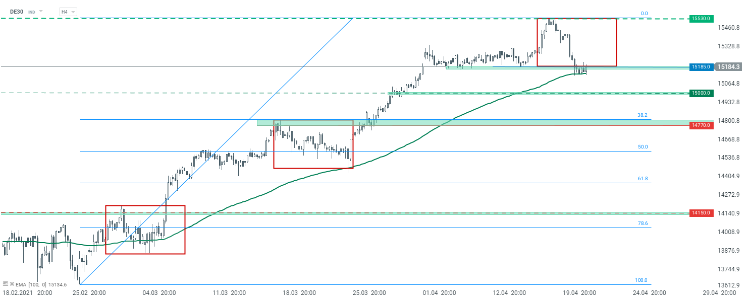 Last but not least, let's take a look at the German DAX (DE30), which has also experienced downward correction in recent days. However, looking at the H4 interval, we can see that buyers halted declines at the 100-period moving average. The price is also struggling to break back above the lower limit of 1:1 structure at 15,185 pts. Should buyers manage to halt declines there, another upward swing impulse may be about to start. On the other hand, should sellers manage to take the price below the aforementioned moving average, the bigger downward correction may start. In such a scenario the next support to watch lies near the 15,000 pts handle, and the next one is located at 14,770 pts.