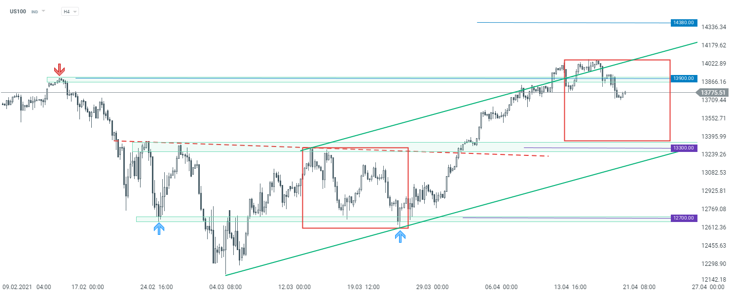 Secondly, let’s take a look at the US tech index - Nasdaq-100 (US100). Looking at the H4 interval, we can see that the upward move was stopped and the downward correction started earlier this week. The price returned below the recent local high at 13,900 pts, and the continuation of the correction looks to be a possible scenario. Should bearish sentiment prevail, the nearest key support to watch can be found in the vicinity of 13,300 pts, where the lower limit of 1:1 structure and the previous price reactions are located.