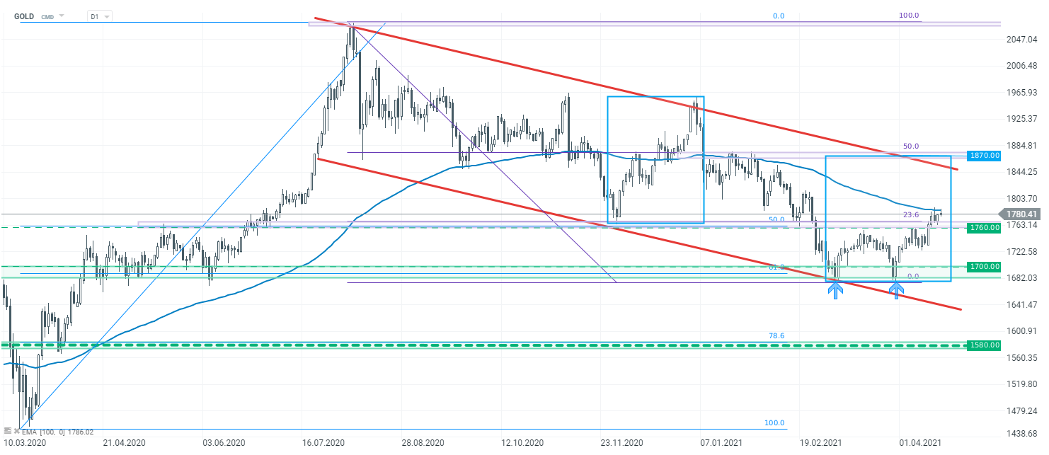 Let’s start today’s analysis with the gold market. Looking at the D1 interval, one can see that an upward correction was launched after price bounced off the $1,700 support and the double bottom pattern was painted. Price broke above the neckline of the formation and reached the 100-period moving average, which may act as short term resistance for now. Should the price break above the aforementioned moving average, a move towards the upper limit of the downward channel looks possible. One should also pay attention to the $1,870 area which is marked with the upper limit of 1:1 structure and 50% Fibonacci retracement of the downard move started in August 2020. On the other hand, if sellers manage to halt upward movement there and break back below the $1760 support, gold may resume the downward move.