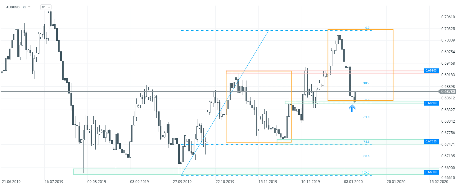 Last but not least, let’s take a look at AUDUSD. The pair reached key support this week. The area at 0.6850 handle is marked with the lower limit of Overbalance structure (yellow rectangles) and the 50% Fibonnaci retracement of the upward swing started in October 2019. As long as the price sits above it, bulls seem to be in markets’ favour. The nearest resistance to watch is the 0.6930 handle and it is marked with previous price reaction. In case of a break higher, the upward move could accelerate and reach late-2019. On the other hand, a break below the aforementioned support at 0.6850, could facilitate an attack on the zone at 0.6755 handle.