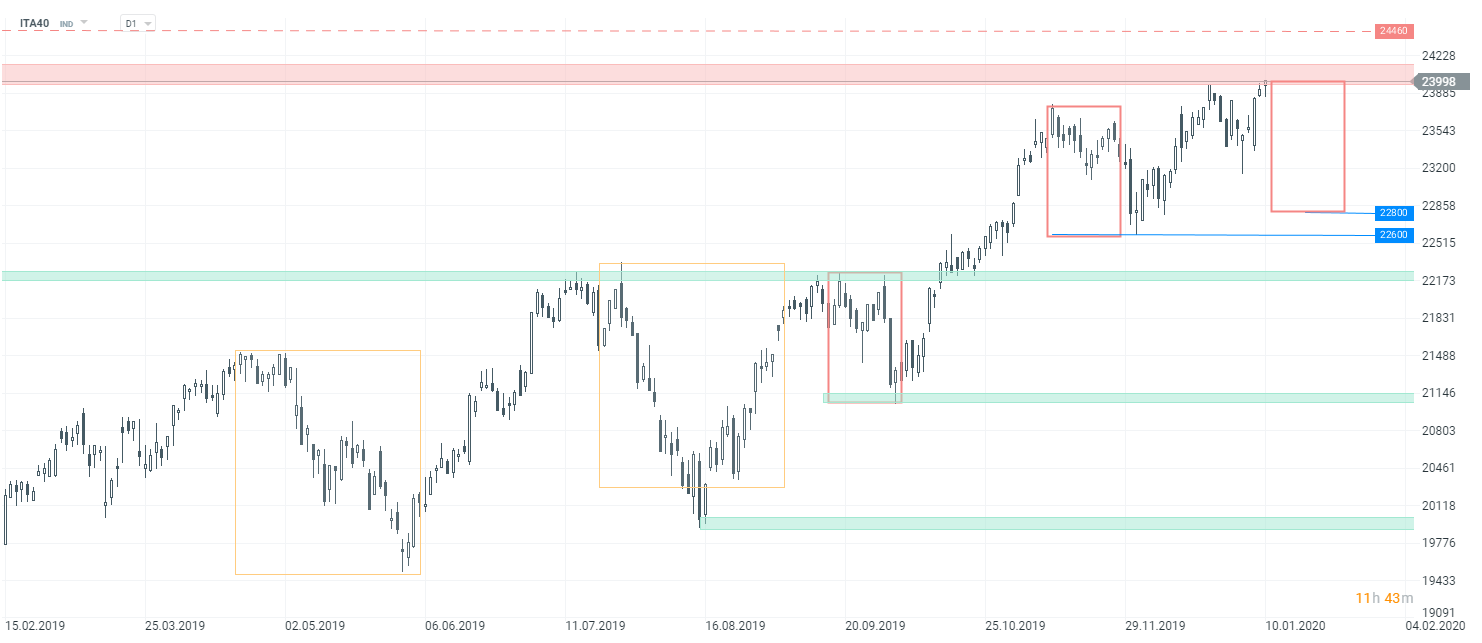 The positive sentiment can be seen all over the world with US indices trading at fresh records and other stock markets also doing well. Let’s look at the situation on the Italian index ITA40. The price is now trading at the key resistance zone which is marked with 2018 highs. In case of a break higher, the index may reach the 24460 pts handle, where all time high can be found. It also looks as a perfect place to start a downward correction. In such a scenario, the move may reach a support at 22800 pts handle. This level is marked with the lower limit of Overbalance structure, which is the range of the biggest downward move during upward impulse started in August 2019. One should also remember that the main trend remains upward therefore going short means going against the market.