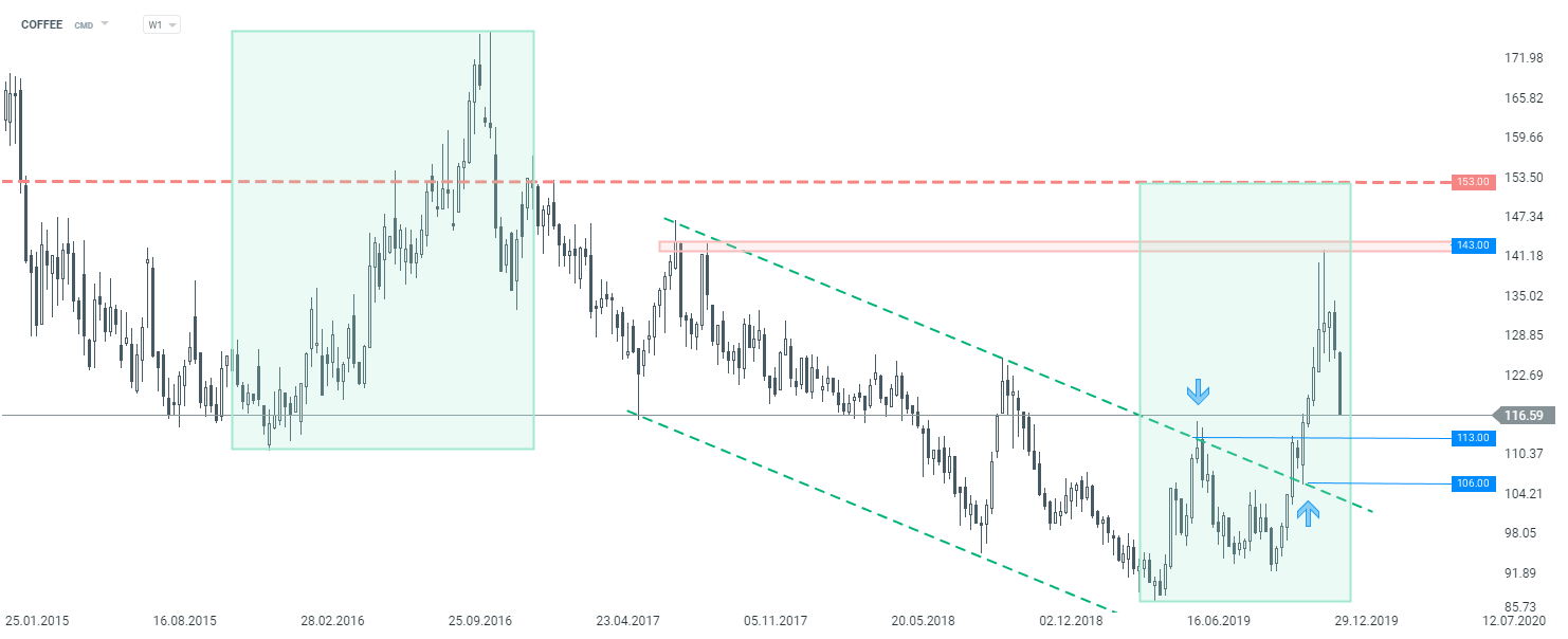 Coffee can be found under selling pressure this week. Following a strong rally sellers took over at 143.00 handle, which is the key resistance marked with price reactions from August 2017. Commodity has declined over 7% this week. The nearest support to watch can be found at 113.00, where the highs from June 2019 are located. In case declines continue to deepen, the next support in line can be found at 106.00 handle.