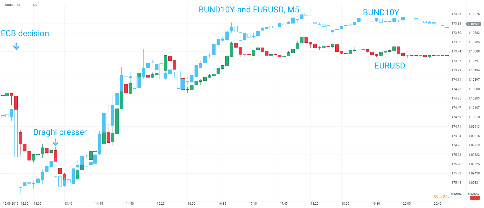 The initial moves in German 10 year bonds and the EURUSD reversed with yields rising sharply during the Draghi press conference and leading a recovery in the single currency. Note the Bund10Y axis is inverted so rising candles indicate lower prices and higher yields. Source: xStation