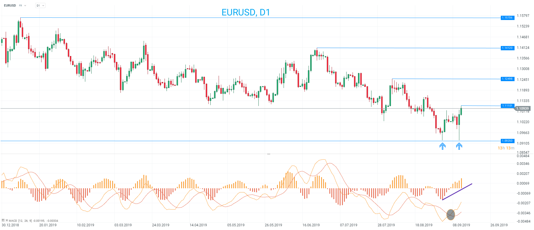 A potential double bottom is forming around 1.0925 in the EURUSD with a bullish hammer printed on D1 after the ECB decision. Positive divergence also seen on MACD. Source: xStation
