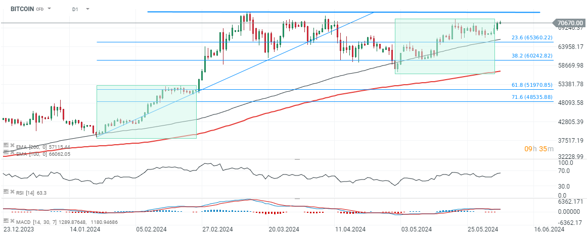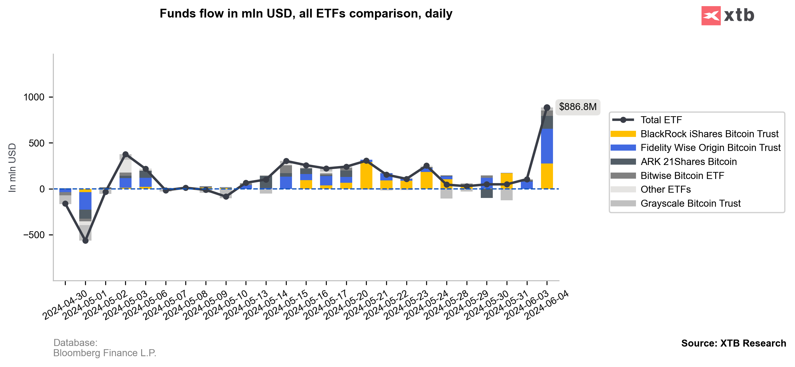 Yesterday, 10 US spot Bitcoin ETFs noted record $886.8 million net inflows, which helped the biggest cryptocurrency bounce back above $70.000. More than $800 million in short positions were liquidated yesterday, but it's still unclear why inflows were so large inside both BlackRock's IBIT and Fidelity FBTC funds. Some speculations signal that perspective of creating Texas-based stock exchange (Texas Stock Exchange) by Citadel Securities and BlackRock, which will 'specialize' in Exchange Traded Products, may fuel the market, but the fact is that yesterday inflows were probably affected by some large buyers - despite weakness on Wall Street and precious metals. Also, weaker macro data from US (and US dollar) may be a trigger to awaited Fed pivot and falling treasury yields, which can increase demand for so-called risky assets.