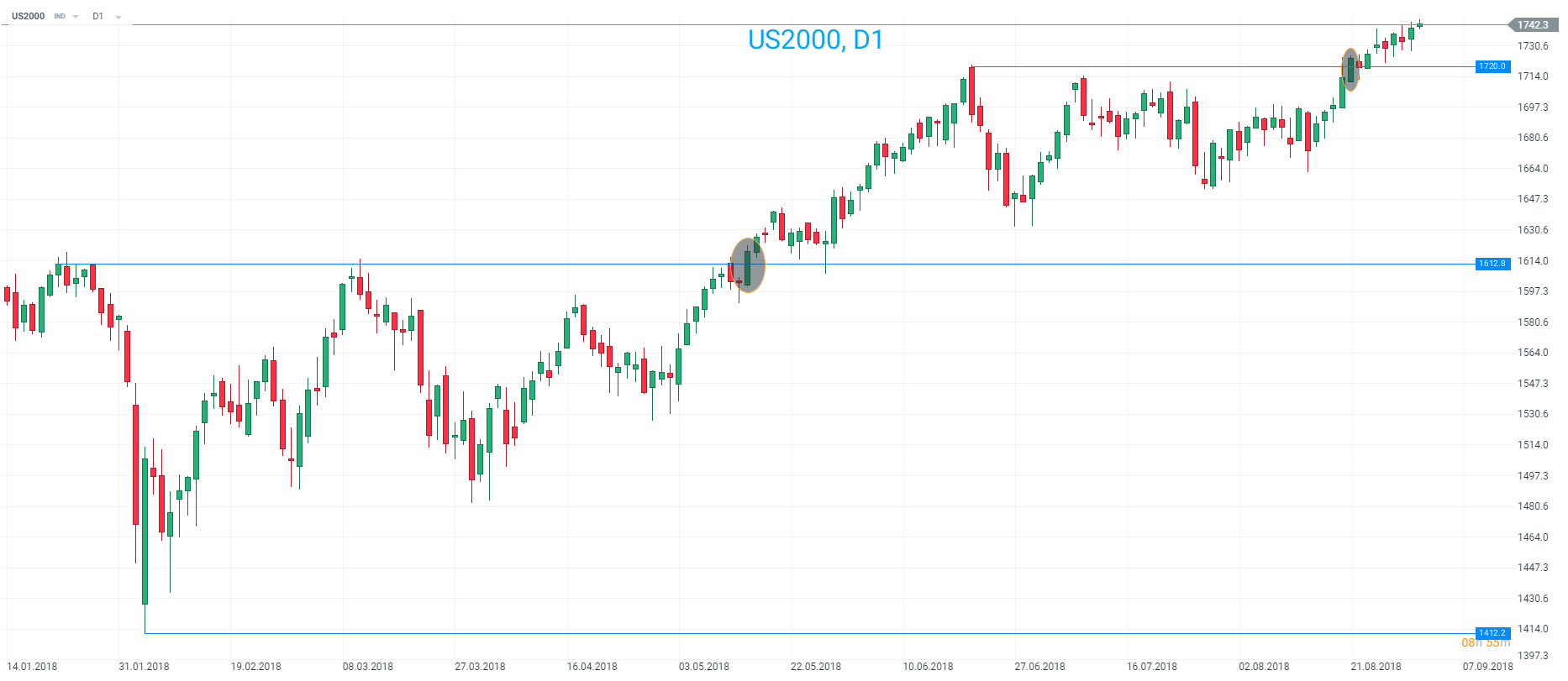 The US2000 has also made record highs of late, but unlike the US500 there has been little by the way of any reversal signs since. The breakout level at 1720 remains important and while price remains above there then it is still valid. Source: xStation