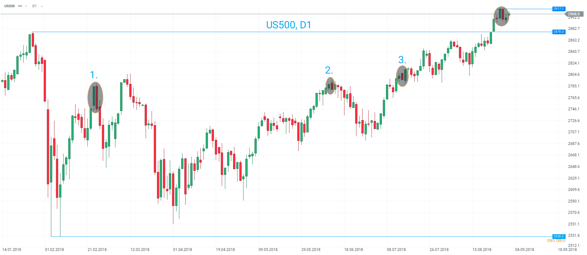 Thursday saw a bearish engulfing candle printed on the US500. Note that one 2 previous occasions in 2018 this has occurred before a sizable pullback but also that the prior occurrence proved a false dawn in mid-July. Source: xStation
