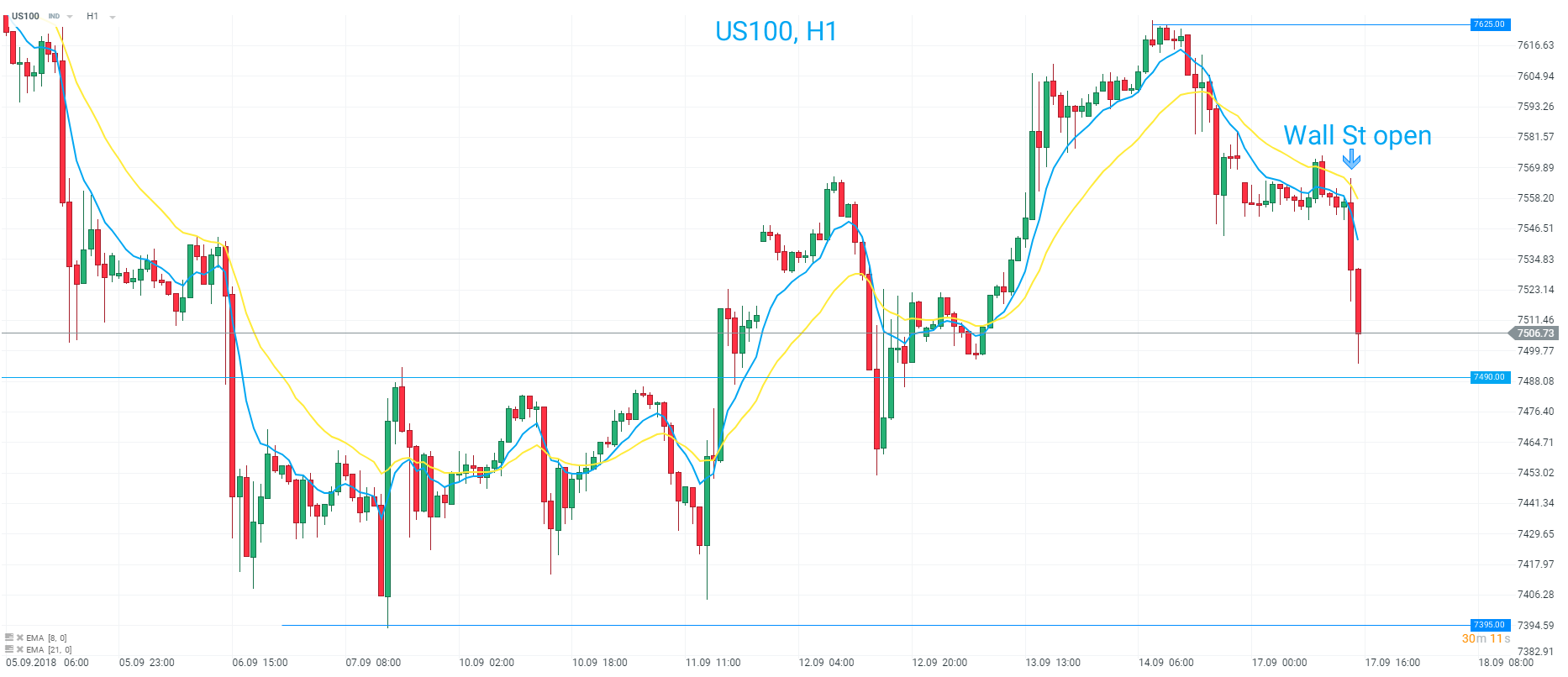 The US100 has seen some fair size selling in the last couple of hours with price falling by around 60 points, or not far off 1%, since the Wall St. open. Source: xStation