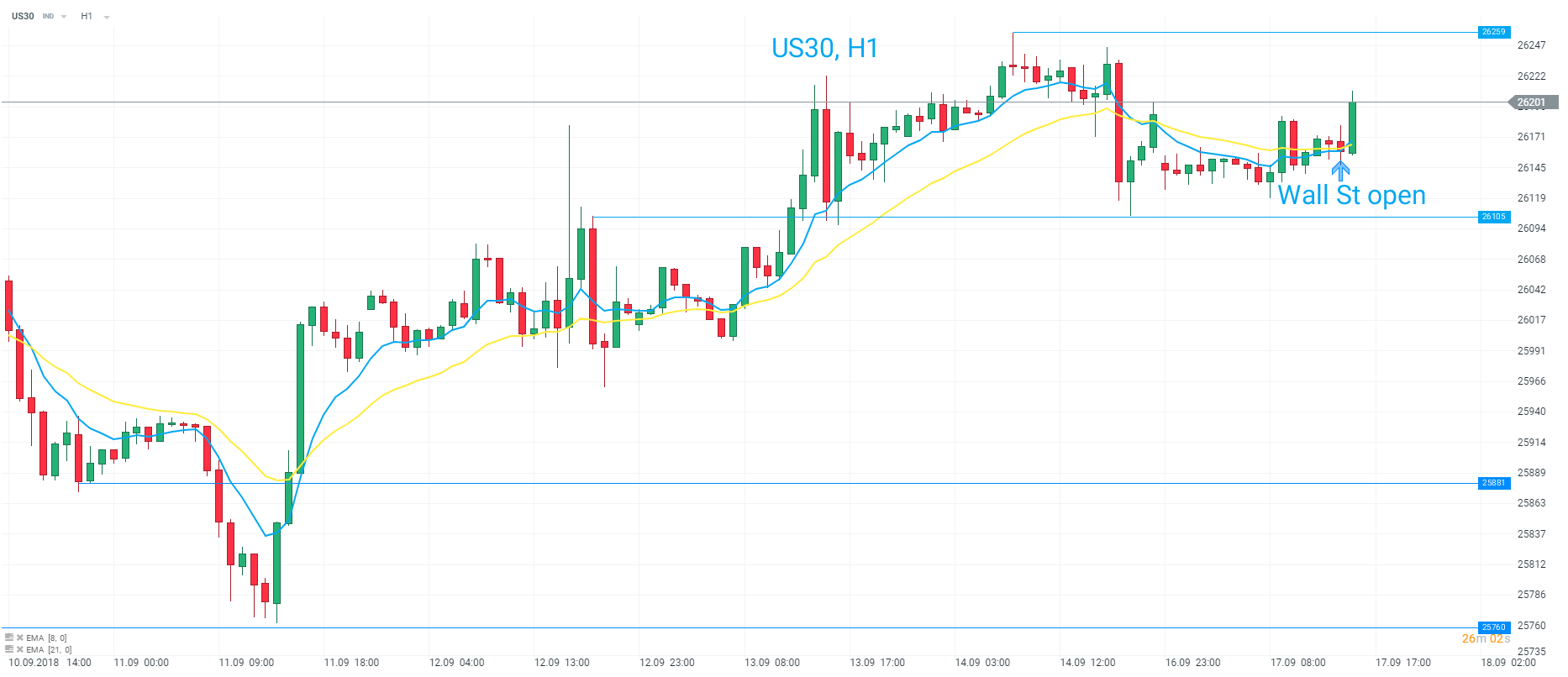 The US30 is enjoying a brighter start to the week with the market pushing higher since the opening bell to hit its highest level of the day. The market could be on the verge of printing a bullish cross of the EMAs and may look to retest last weeks high around 26260 in the not too distant future. Source: xStation
