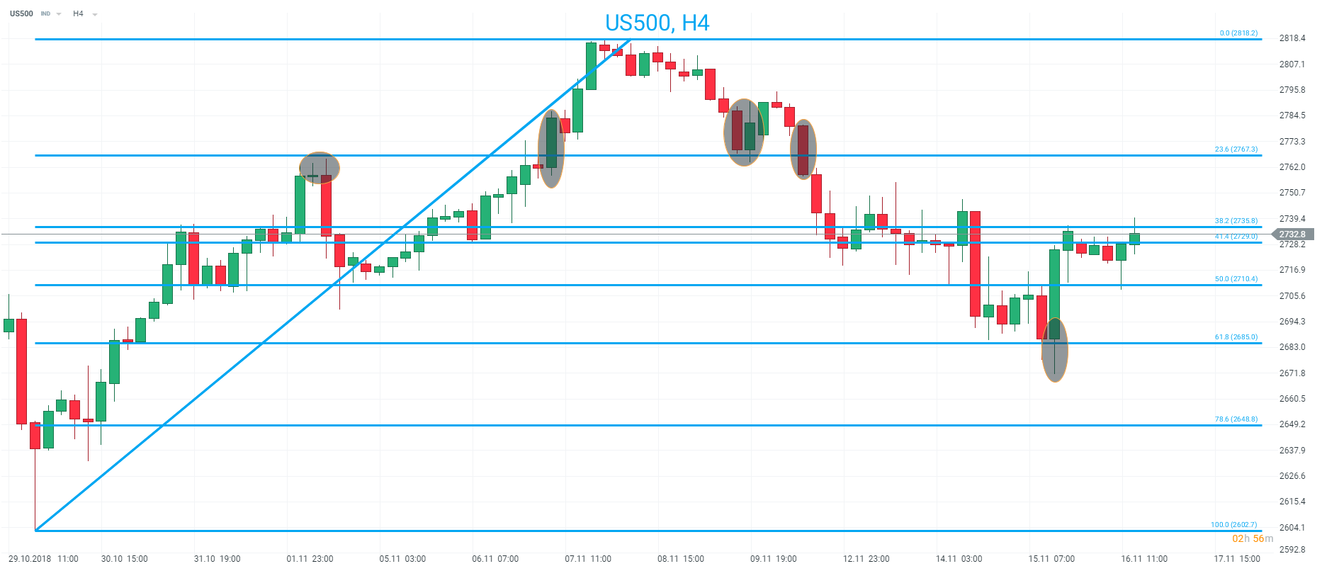The US500 has been playing fib levels nicely with the 38.2% at 2736 acting as resistance and the 61.8% at 2685 offering support. A break outside these would open up the next larger move. Source: xStation