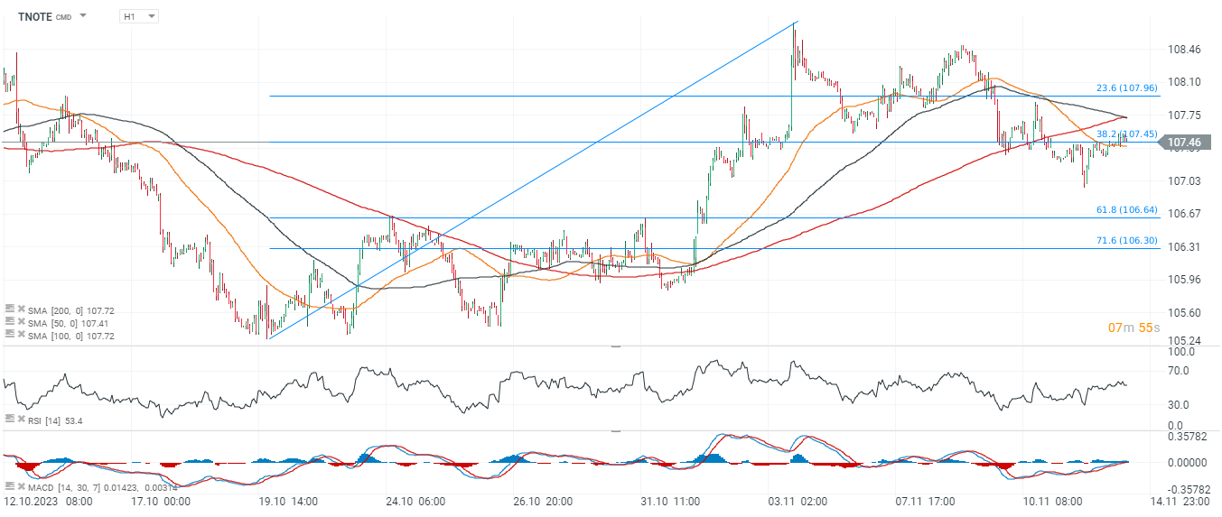 Futures contracts on 10 year US treasuries bonds (TNOTE) are gaining slighlty today. Bulls are trying to hold a support at 38,2 Fibo level od upward wave from the midle of October. Źródło: xStation5