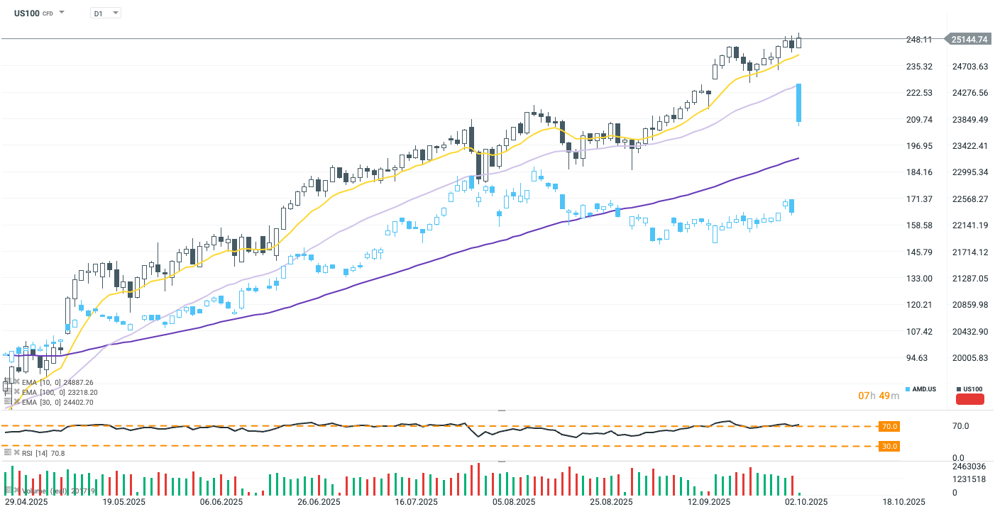 The US equity market shows resilience entering another week of a shutdown, as the freshly announced partnership between AMD and OpenAI fuels once again the AI optimism. Tech-heavy Nasdaq leads gains (US100: +0.65%), followed by small-cap Russell 2000 (US2000: +0.35%), S&P500 (+0.1%), while Dow Jones Industrial Average edges down (US30: -0.5%).