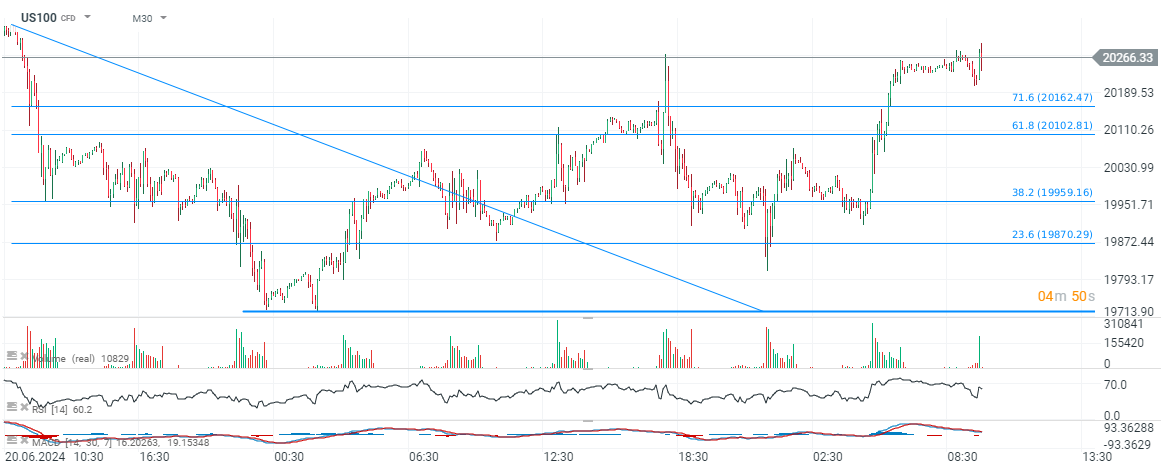 Nasdaq 100 (US100) futures are gaining less than 0.2% today; buying volume prevails. The first reaction to weaker ISM data was positive. Source: xStation5