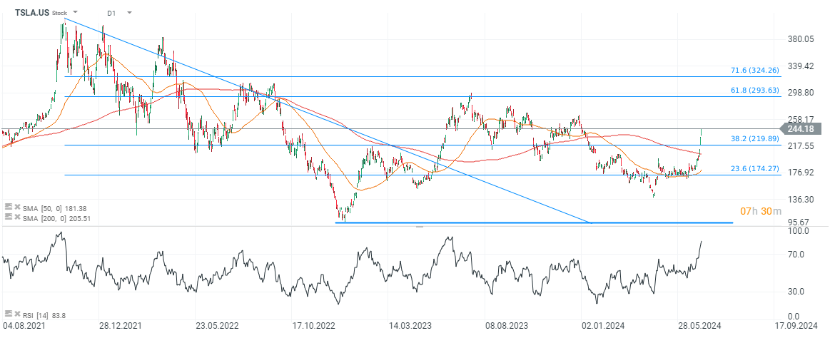 Most U.S. indices are slightly gaining after the US market opening. US100 trades up 0.15%, driven by a drop in bond yields and another very good performance from Tesla (TSLA.US), which add 5% after yesterday rally. The U.S. macro data suggest that the U.S. economy is slowly entering a slowdown, while the labour market remains still relatively resilient to it. After much weaker than expected ISM data, ISM chair, Miller, pointed out that June Services PMI indicates the overall US economy is contracting for the first time in 17 months. Yields on 10-year U.S. Treasury bonds are down more than 9 percentage points today, to 4.34%. Such a scenario allows Wall Street to increase bets on Federal Reserve rate cuts in early fall, this year.