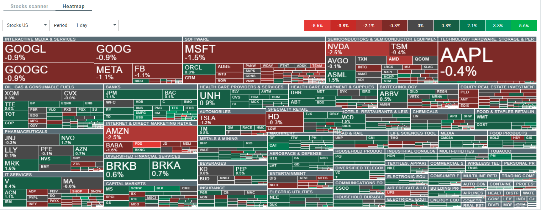 S&P 500 index stocks categorized by sectors and industries. Size represents market cap. Source: xStation5