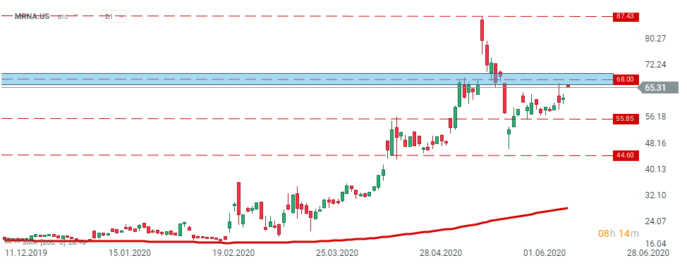 Moderna (MRNA.US) - stock price is approaching local resistance level at $68.00. Breaking above it may trigger upward impulse towards $87.43. On the other hand local support can be found at $55.85. Source: xStation5