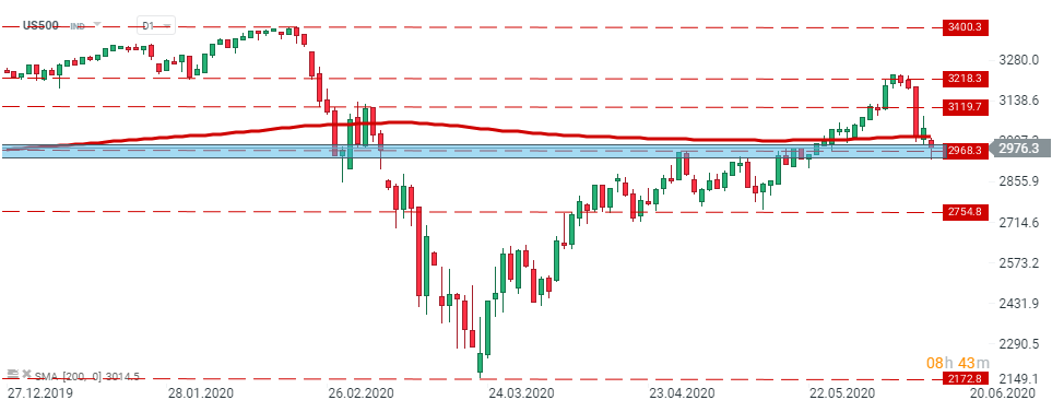 S&P500 (US500) is testing major support at 2968.3 pts. Should downbeat moods prevail, next support at 2754.8 pts may come into play. However, if there is a change in market sentiment then local resistance can be found at 3119.7 pts. Source: xStation5