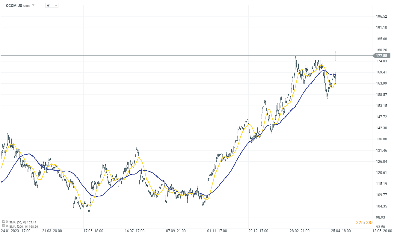 Qualcomm (QCOM.US) gains 7.70% following an upbeat Q2 performance and positive Q3 outlook. Qualcomm forecasts Q3 revenue between $8.8B and $9.6B (consensus of $9.05B) and adjusted EPS between $2.15 and $2.35 (consensus of $2.16). CEO Cristiano Amon highlighted the company's growth, diversification, and advancements in automotive sales, Snapdragon X launches, and on-device AI capabilities.