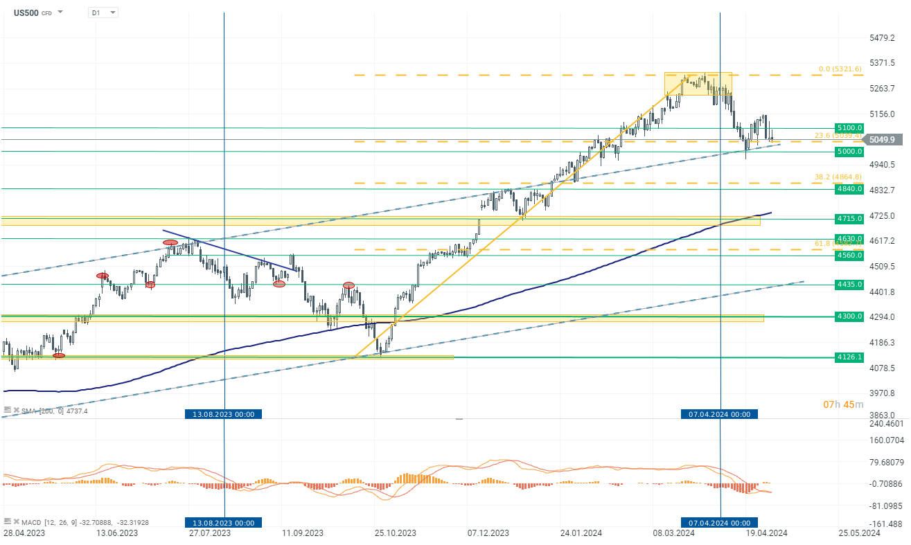 US500 futures on the S&P 500 index are trading around zero today. However, at the time of publication, bulls are dominating the market. The index is up 0.15% to 5060 points. The current key support level is in the 5000-5040 points range. This is where the 23.6% Fibonacci retracement of the recent upward movement converges, and it's also a significant support level and an upward trend line marked on the chart with a dashed blue line.