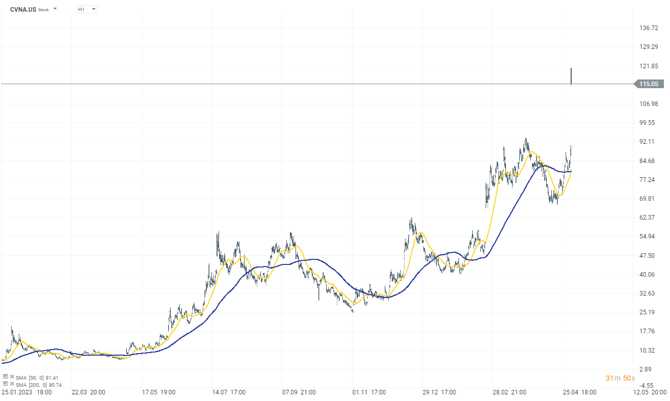 Carvana (CVNA.US) soared over 35% after a successful Q1, with 91,878 cars sold, marking a 16% Y/Y increase despite less inventory and reduced marketing spending. This is the company's third consecutive quarter with positive net income, with adjusted EBITDA surpassing expenses. Carvana anticipates continued growth in Q2, with increased sales and profitability.